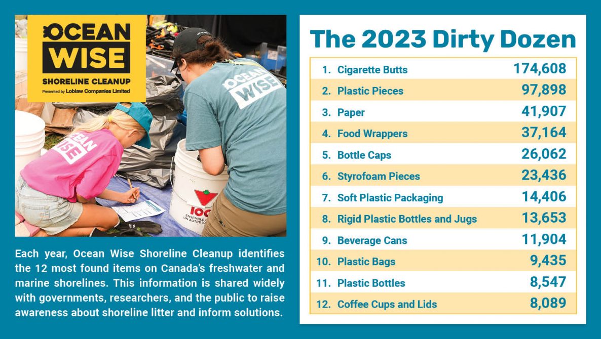 Each year, citizen science data collected by the Ocean Wise Shoreline Cleanup reveal the “Dirty Dozen,” a list of the most-found litter across Canada.