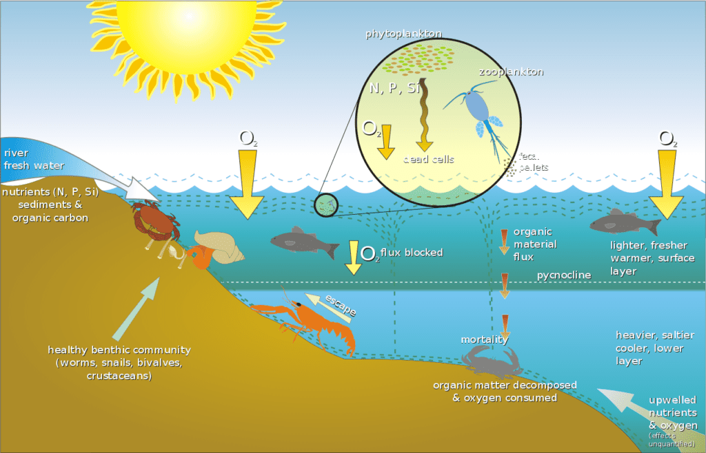 Stratification occurs when cold dense salt water and less dense freshwater mix, creating two separate layers with the freshwater on top. This is natural to see in places like an estuary, where the freshwater river meets the ocean. Stratification can create two separate zones in the same geographical location because of this difference in temperature. It can however, cause algae to increasingly grow due to nutrient overload, and the lower colder habitat to collapse.