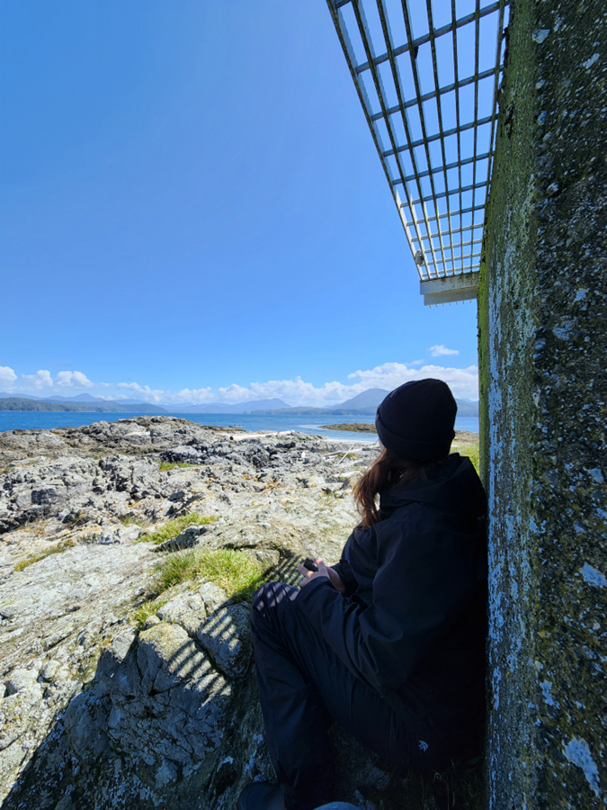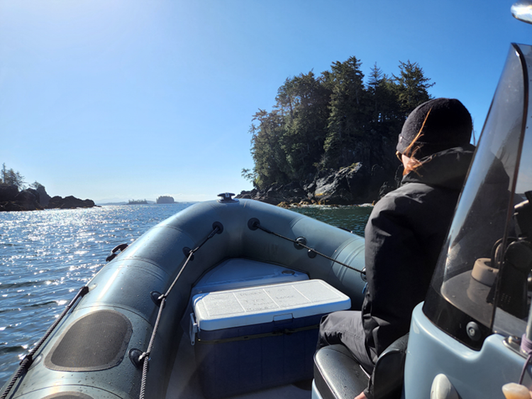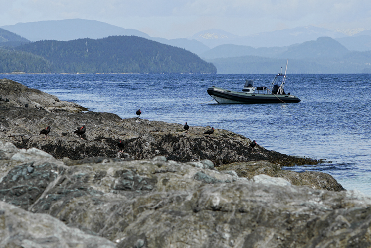 Il est temps de se réveiller. Heureusement, le trajet en bateau du port d’Ucluelet jusqu’aux îles du Broken Group, où a lieu le baguage, n’est pas long. Cela signifie que le début de la journée n’est pas trop tôt (hourra !). Il y a beaucoup de temps pour prendre un bon petit-déjeuner, choisir des vêtements adaptés au temps et préparer mon sac à dos. À ce moment-là, l’équipe est généralement en contact pour discuter si les conditions de l’eau et la météo seront adaptées à la baguette des huîtriers noirs.