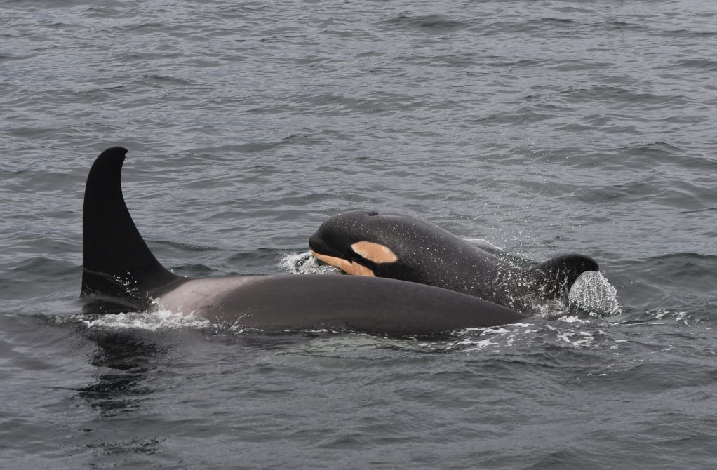 Les A42 – une lignée matrilinéaire incluse dans le groupe de 15 – ne visitent la mer des Salish que quelques fois par an et sont connus pour se frotter le ventre sur les plages de galets près de Sechelt, un comportement unique à cette population. Cette famille d’épaulards est devenue familière à la communauté locale, dont beaucoup peuvent identifier ces individus à vue. Contrairement aux épaulards de Bigg (migrateurs) qui sont plus souvent repérés dans la région, les épaulards résidents ont tendance à avoir des nageoires incurvées ou arrondies et des plaques de selle ouvertes. La matriarche A42 (Sonora) en est un excellent exemple, et son apparence unique la rend facile à identifier. Leur visite a été particulièrement spéciale cette année, avec la première observation du nouveau baleineau d’A79 (Current) et l’apparition de tous les membres du groupe A5 voyageant aux côtés des A42.
