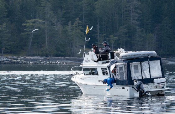 C’est ce que l’initiative Ocean Wise a découvert sur l’eau ! Opérant en vertu du permis de recherche MML-18, l’équipe a passé deux jours à recueillir des échantillons de proies et d’ADN environnemental des baleines afin de mieux comprendre le régime alimentaire hivernal de ces baleines. L’ADN environnemental (ADNe) provient du matériel génétique des cellules de la peau et du matériel fécal qui est laissé dans l’eau lorsqu’une baleine plonge. Les chercheurs d’Ocean Wise collectent cet ADNe de manière peu invasive via notre navire de recherche, Skana, en s’approchant de la zone après les plongées des baleines et en prélevant de l’eau de l’empreinte caudale (la zone d’eau calme et circulaire qui est laissée derrière après les plongées d’une baleine).