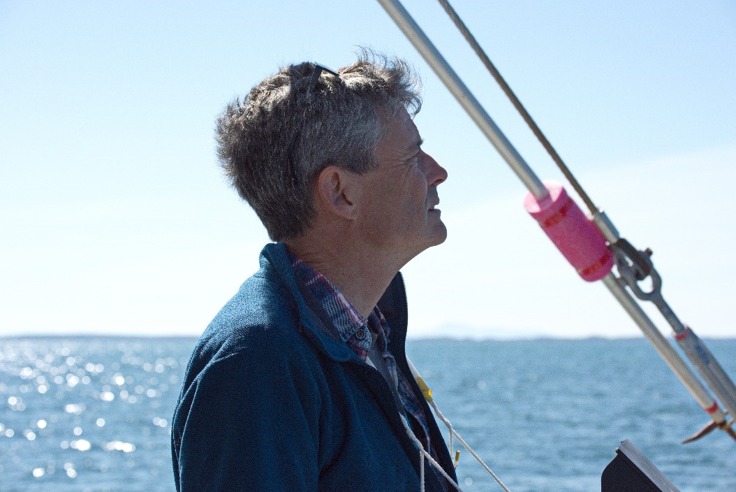 - L’équipe a célébré la fête du Canada, le1er juillet, avec sa dernière journée de terrain de la saison de la côte centrale. Commençant par une matinée très brumeuse, l’équipe faisait du « picking » (en laissant tomber l’hydrophone et en écoutant les appels des épaulards) à la recherche de baleines. Lors de sa deuxième tentative de pickling, la musique aux oreilles de ses membres – des appels d’épaulards – a été captée. Avec un épais brouillard et aucun point de référence sur la source des bruits de baleine, Lance sortit la parabole directionnelle de l’hydrophone pour localiser d’où venaient les appels. Après avoir parcouru deux miles dans la direction qu’il avait identifiée, l’équipe s’arrêta et laissa tomber l’hydrophone dans l’eau. Pendant que Lance et Dylan écoutaient l’hydrophone sur la terrasse arrière, Brittany se dirigea vers l’avant pour écouter les coups. Après cinq minutes, elle les entendit – des épaulards droit devant.