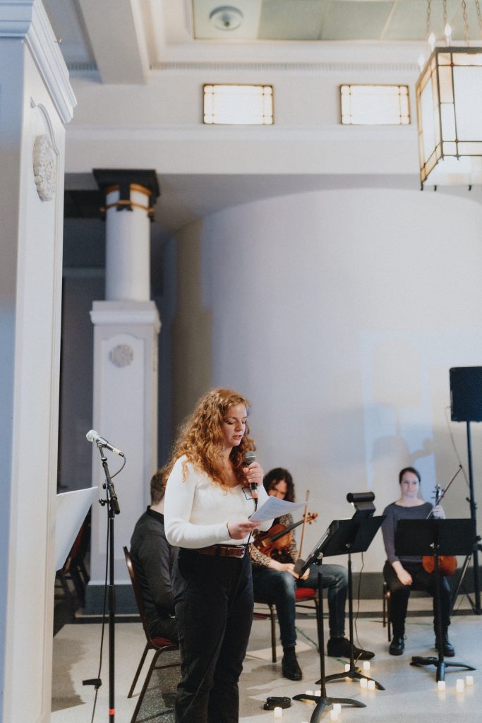 Nous avons commencé la soirée par une ouverture à froid des musiciens et des présentations des responsables du projet, puis nous avons demandé au public de chanter ensemble avant que les musiciens ne se produisent. Une fois que la musique a fait réfléchir les gens, nous passons directement à la partie dialogue. Le dialogue a mené à ce que nous avons appelé « l’improvisation collective », où nous avons demandé aux musiciens d’improviser un morceau de musique sur un film muet composé d’images communautaires de nos moments préférés dans la nature. Pendant l’improvisation collective, nous avons également donné au public la liberté de se déplacer dans la pièce et d’écrire sur la façon dont la musique les aidait à se connecter les uns aux autres ou au changement climatique.