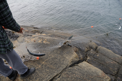 Nous avons réglé le filet à 13h30 de l’après-midi sur un système de boucles simple. La boucle permet de tirer le filet vers l’intérieur, le vider et le retirer sans avoir besoin d’être mouillé. Des rochers assuraient les ancres aux deux extrémités.