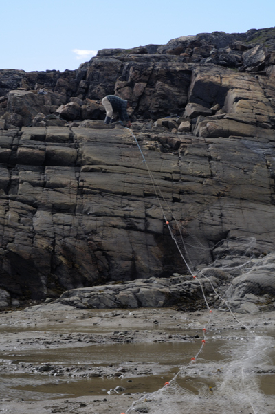 La baie de Frobisher peut connaître des changements de marée allant jusqu’à 13 mètres, et lorsque la marée est basse, il est facile de longer le fond marin exposé pour poser un filet.
