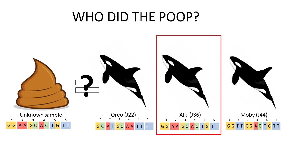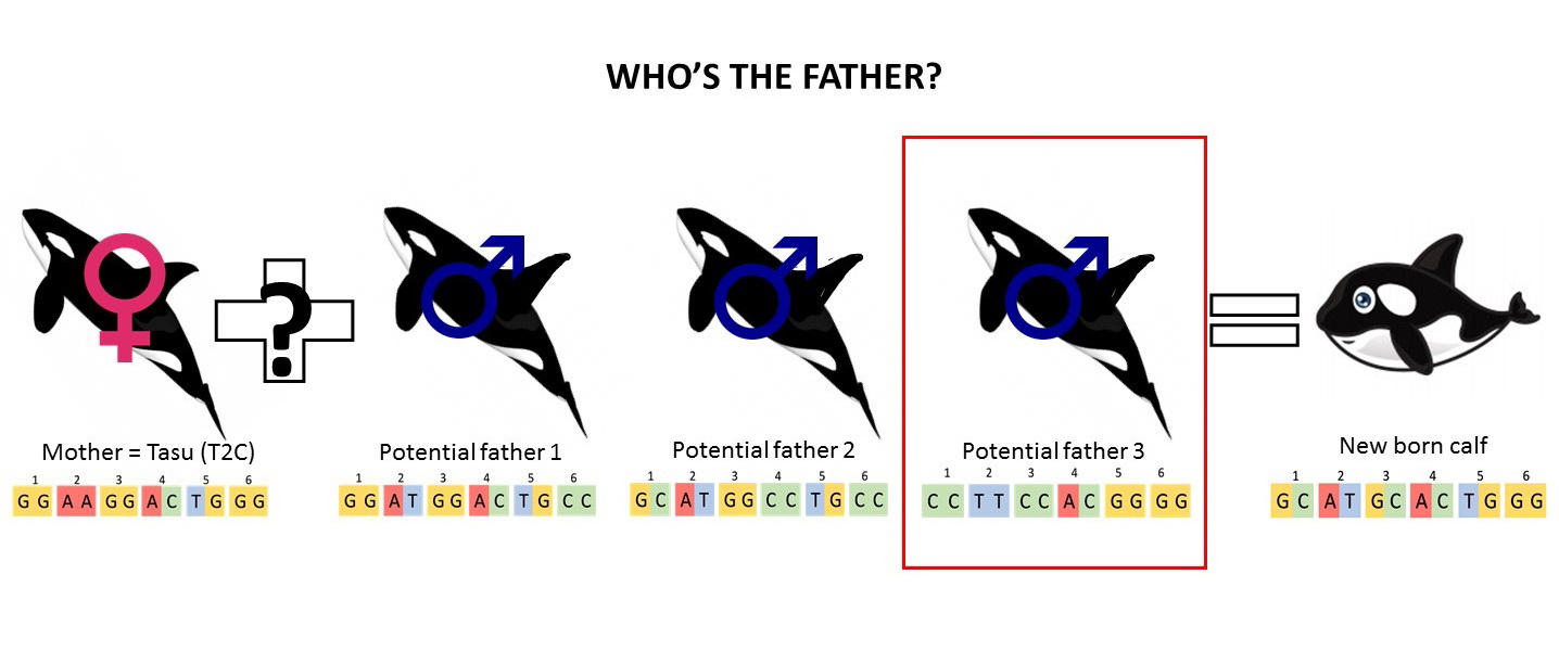 Le génome de l’épaulard est composé de plus de 2,2 milliards de bases nucléotidiques (la « colonne vertébrale » de la molécule d’ADN. Chaque base est l’une des quatre unités chimiques, représentées par une lettre correspondante : A=Adénine, G=Guanine, T=Thymine et C=Cytosine) et peut être « lue » via le séquençage de l’ADN. Il faudrait beaucoup de temps et d’efforts pour lire l’ensemble du génome, dont 99,9 % est identique chez tous les épaulards (et dans de nombreux autres mammifères), c’est pourquoi les généticiens ont développé des méthodes pour examiner des parties spécifiques du génome qui varient généralement entre les animaux d’une population. En examinant suffisamment de ces parties variables, les chercheurs peuvent identifier une baleine spécifique à partir de son « empreinte digitale » génétique.