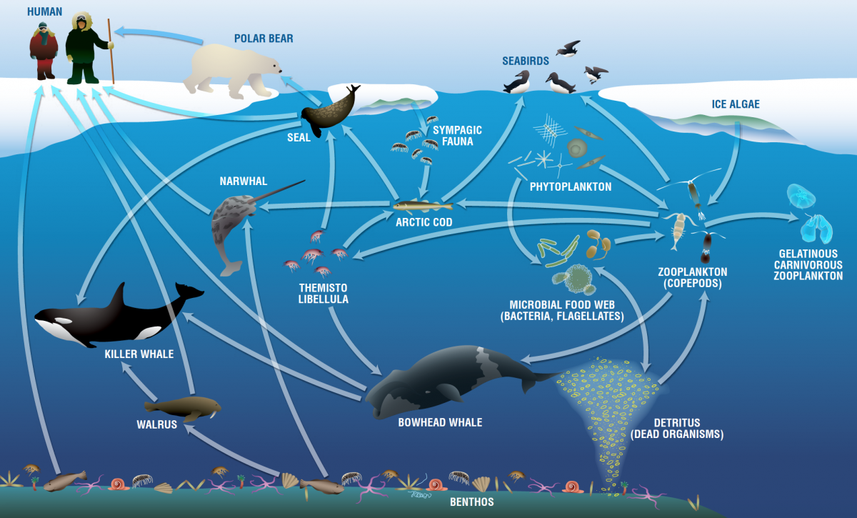 Si vous avez déjà entendu parler d’une chaîne alimentaire, je vous invite dès maintenant à réfléchir à un réseau alimentaire marin – c’est-à-dire le réseau interconnecté de chaînes alimentaires qui compose l’écosystème océanique (voir le réseau trophique arctique ci-dessous). Parce que les réseaux alimentaires marins sont si interconnectés, lorsque nous interagissons avec eux au cours de la pêche, il est important de prendre aussi en compte les besoins de l’écosystème en plus de nos propres besoins alimentaires en tenant compte des volumes totaux que nous pêcheons.