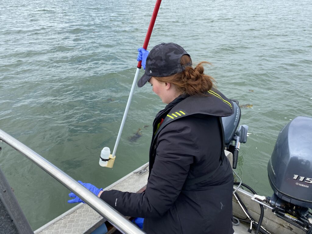 Forts de notre succès avec les études sur les empreintes de douve et l’ADN fécal, nous avons récemment mené une étude pilote sur la faisabilité de la détection de l’ADN électronique à partir d’échantillons d’eau. Pour ce faire, nous avons recueilli des échantillons d’eau à 15 stations fixes autour des eaux de Chatham Sound, dans le nord de la Colombie-Britannique, à une profondeur d’environ 1,5 m, à l’aide d’une perche de 2 mètres de long. En même temps, nous avons écouté les baleines à l’aide d’un hydrophone et nous avons fait un relevé visuel de l’eau pour les repérer afin de pouvoir comparer les résultats de présence avec l’ADN électronique. Nous avons effectué cette opération quatre fois entre les mois de juin et d’octobre, et nous utiliserons ces échantillons pour voir si nous pouvons déterminer la présence de baleines à bosse et de marsouins communs dans la région en utilisant une approche ADN mono-espèce. Nous sommes impatients de voir comment les résultats de l’ADN électronique se comparent aux détections visuelles et acoustiques dans les stations !