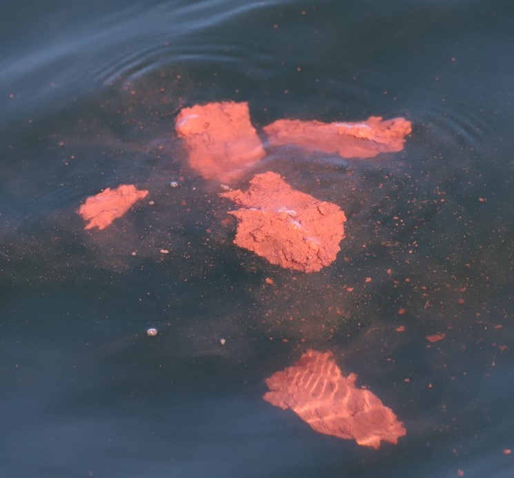 Nous avons commencé à effectuer des travaux sur l’ADN des mammifères marins de la côte Nord en recueillant des échantillons opportunistes d'”empreintes de pattes” sur des baleines à bosse et des marsouins communs. Lorsque les baleines plongent, elles laissent souvent un cercle visible dans l’eau (une rupture de la tension de surface) à l’endroit où elles se trouvaient la dernière fois à la surface. C’est l’endroit idéal pour recueillir un échantillon d’ADN électronique. À partir de celui-ci, nous pouvons même déterminer le sexe de l’animal. Nous avons collecté près de 70 échantillons d’empreintes de douve rien que cet été ! Si nous avons de la chance, ils laisseront aussi quelque chose d’autre pour nous. Vous pouvez regarder l’image ci-dessous et vous demander ce que c’est… de la barbe à papa ? De la cervelle ? De la viande ? La réponse est sans doute bien plus excitante (et odorante). Il s’agit du caca de la baleine à bosse. La collecte d’échantillons fécaux est un autre moyen très opportuniste de recueillir de l’ADN. Cela n’arrive pas souvent, mais quand c’est le cas, nous n’hésitons pas à le faire.