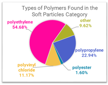 Quel type de plastique ont-ils trouvé ? Plus de la moitié des morceaux de plastique souple découverts étaient un type de polymère plastique appelé polyéthylène (PE), qui est normalement utilisé dans des produits tels que les sacs d’épicerie, les bouteilles d’eau et les filets à fruits. Un polymère est une grande molécule composée de nombreuses petites unités appelées monomères. Les autres polymères plastiques les plus courants découverts sont le polypropylène (PP), le chlorure de polyvinyle (PVC), le polystyrène (PS), le polyester (PET) et d’autres comme la cellulose, le caoutchouc nitrile, le polyuréthane et le verre combiné.