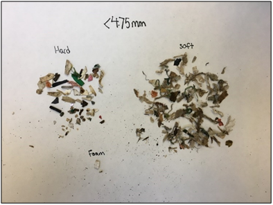 Le Plastics Lab a découvert que les petits morceaux de plastique étaient plus abondants et diversifiés dans les échantillons de compost. Cela signifie que les gros morceaux de plastique se décomposent en petits morceaux et constituent la principale source de microplastiques dans notre compost ! Nous appelons la décomposition des plastiques en petits morceaux les microplastiques secondaires. L’alternative est constituée par les microplastiques primaires qui sont fabriqués en usine pour être petits, comme les microbilles ou les nurdles.
