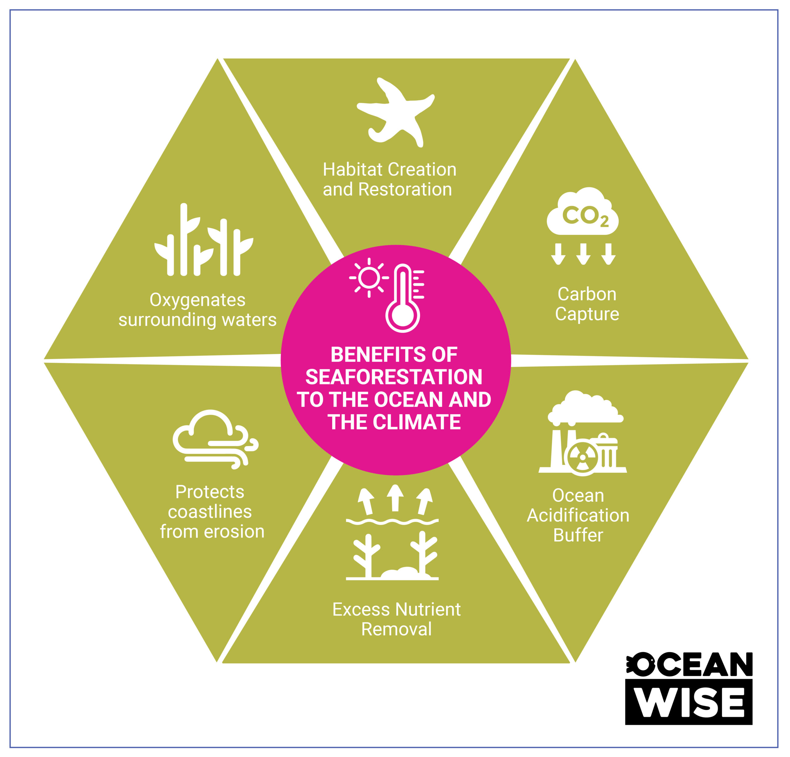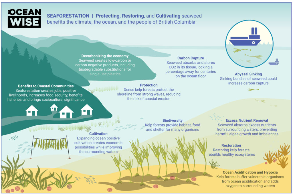 En décroissant la restauration, la protection et la culture des varechs, la Colombie-Britannique peut permettre une élimination significative des gaz à effet de serre nocifs de l’atmosphère, tout en réalisant plusieurs co-bénéfices pour l’océan, les communautés côtières et la vie marine. En plus d’éliminer le dioxyde de carbone de l’atmosphère, la reforestation marine améliore également la santé des écosystèmes océaniques, restaure les pêches côtières et crée des emplois axés sur l’environnement en Colombie-Britannique.
