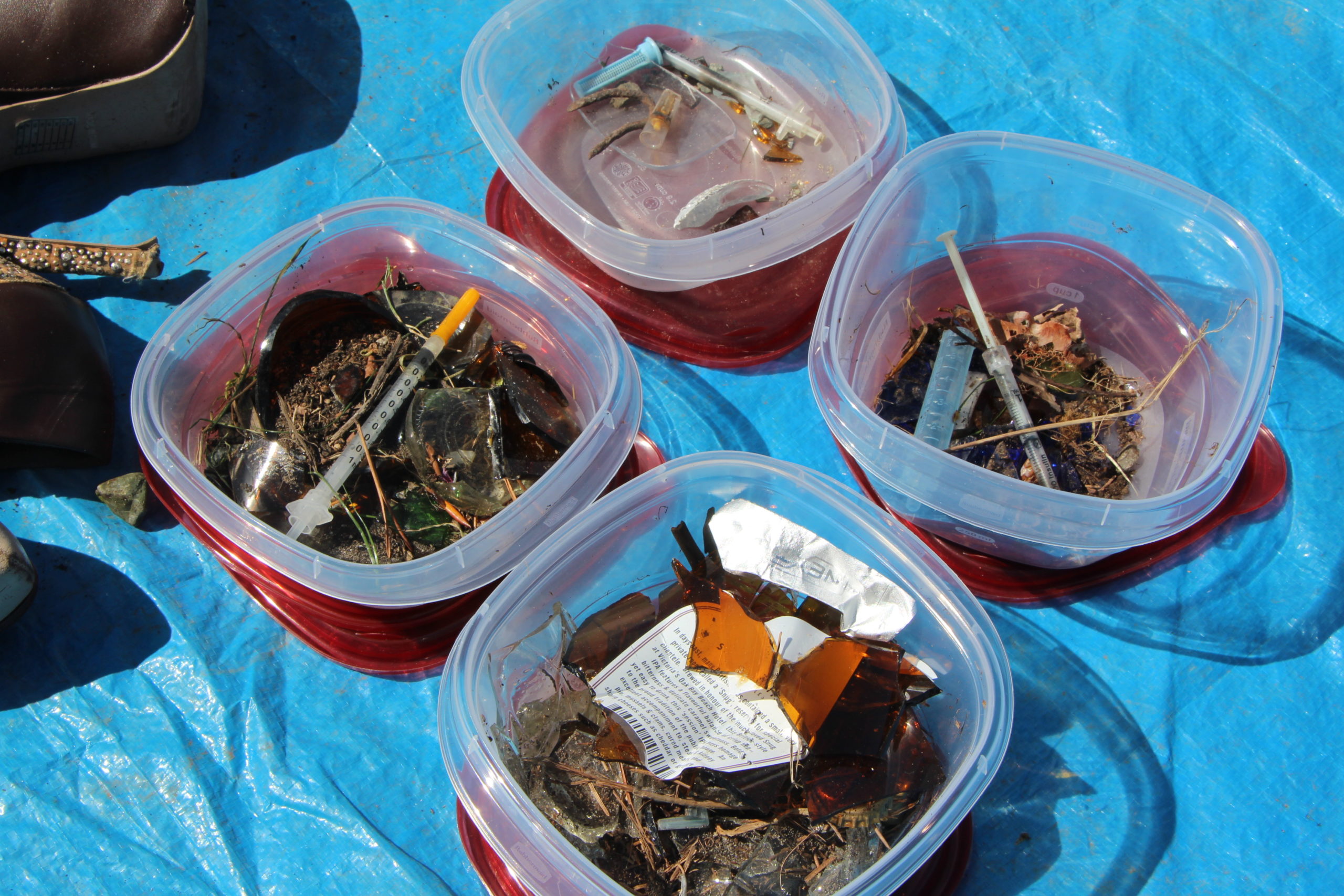 Il est courant que des volontaires tombent sur des objets tranchants sur le rivage, y compris des seringues et du verre brisé. Merci de rappeler à votre équipe de ne jamais manipuler ces objets à mains nues et de placer tous les objets tranchants dans un contenant à objets tranchants (un contenant rigide, idéalement en métal ou en plastique). Si vous avez des jeunes bénévoles dans votre groupe, assurez-vous qu’ils sachent qu’ils ne doivent jamais manipuler seuls des objets tranchants et prévenez un adulte s’ils en rencontrent pendant le nettoyage.