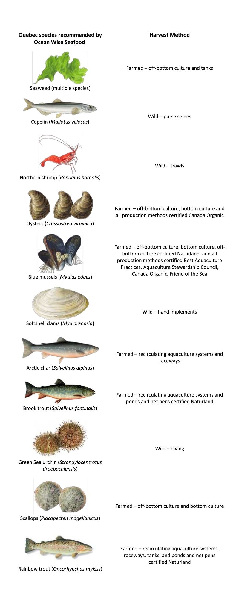Notez que tous les produits de la mer (sauf les anguilles) élevés par des systèmes d’aquaculture à recirculation sont recommandés par Ocean Wise Seafood.