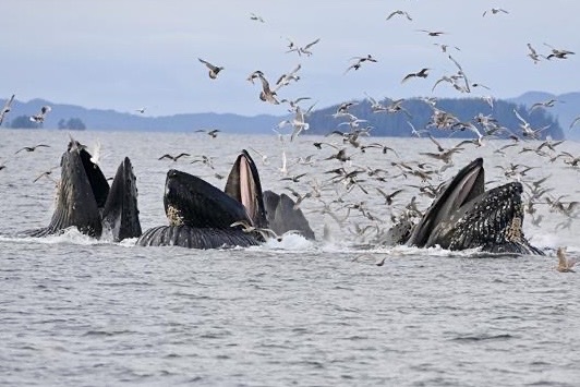 Les zones d’alimentation nordiques des baleines, en particulier le long de la côte de la Colombie-Britannique, sont cruciales non seulement pour les baleines mais aussi pour l’écosystème marin plus large. Ici, le hareng du Pacifique joue un rôle clé dans la chaîne alimentaire. Ces petits poissons gras sont un aliment de base pour de nombreux prédateurs, notamment les baleines à bosse, les otaries de mer, les oiseaux marins et les poissons plus gros, comme le saumon.