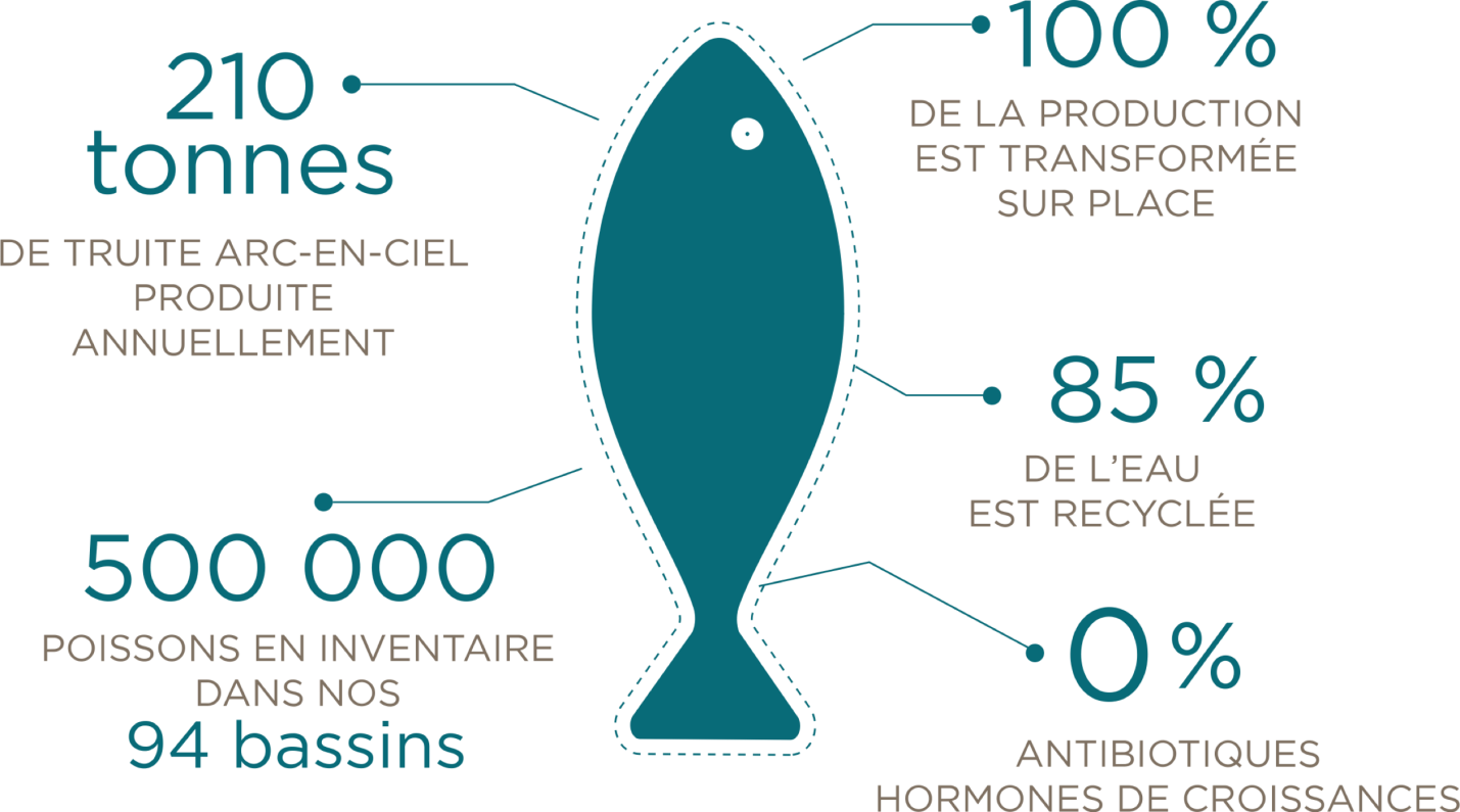 Nous sommes le plus grand producteur de truites arc-en-ciel au Québec. La ferme, produit annuellement 210 tonnes de truites dans ses 94 bassins. Nous représentons 10 % de la truite vendue dans la province. Notre entreprise va très bien mais malheureusement, la grande majorité des truites vendues au Québec ne sont pas des produits locaux. Plusieurs produits proviennent des pays comme le Pérou et le Chili ; produits qui ne sont pas soumis aux mêmes règles environnementales.
