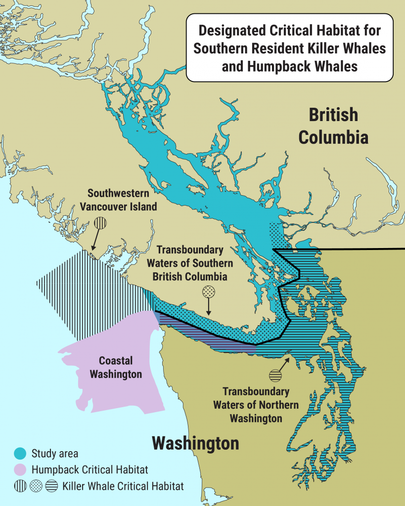 La mer des Salish est une masse d’eau écologiquement importante qui s’étend de l’État de Washington (États-Unis) au sud à la Colombie-Britannique (Canada) au nord. Elle englobe un habitat important pour les orques résidentes du Sud et les baleines à bosse, qui souffrent toutes deux de l’impact des perturbations causées par les navires, de la réduction de la disponibilité des proies et de la pollution des océans.