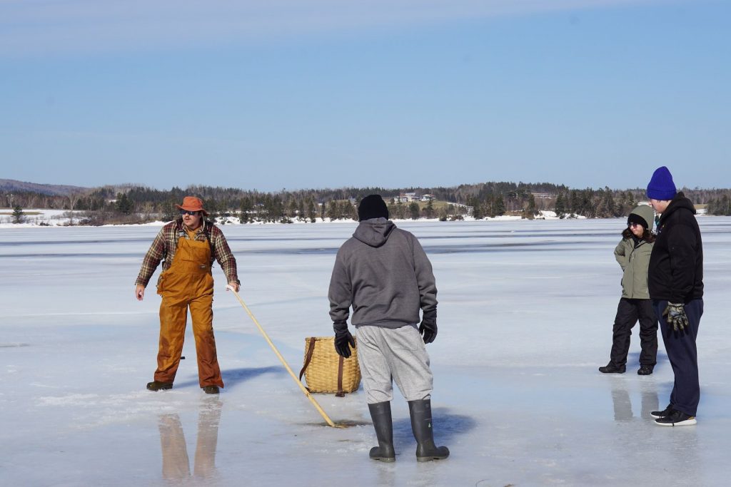 Dans le segment suivant, les participants ont participé à un atelier pratique d’eeling hivernal animé par James Doucette de Reclaiming Our Roots. Grâce à l’apprentissage expérientiel, les participants ont appris des techniques traditionnelles de harpon pour attraper l’anguille dans la boue, tout en respectant le rôle de l’anguille dans la culture et l’écosystème mi’kmaq. Un aspect essentiel de l’atelier était l’offrande cérémonielle de la première prise au kitpu (pygargue à tête blanche), symbolisant la gratitude et la réciprocité avec le monde naturel. Les participants ont également appris à dépecer et à traiter l’anguille, préservant ainsi les connaissances ancestrales pour les générations futures.