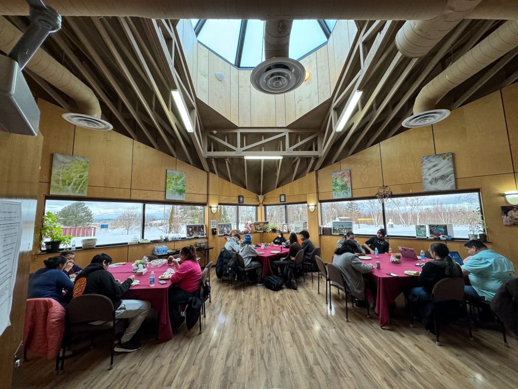 Notre premier segment, le Mawio’mi jeunesse de mi-hiver, s’est déroulé au parc patrimonial de Membertou. Commençant par un festin communautaire et une cérémonie dirigée par l’aînée Yvonne Meunier, les participants participèrent à une offrande sacrée d’une assiette spirituelle à Apuknajit, l’esprit de l’hiver. Suivi par Jeff Ward chantant le chant de l’ours en l’honneur du récent décès de Danny Paul, gardien du savoir, porteur de cornemuse, danseur et chasseur dans notre communauté de Membertou. Alors conférencier, Clifford Paul, coordinateur de la gestion des orignaux à l’Institut Unama’ki des ressources naturelles, a éclairé l’auditoire sur des concepts cruciaux au cœur des modes de connaissance et d’existence des Mi’kmaq. Les participants ont exploré l’essence de la durabilité à travers le prisme de Netukulimk, qui incarne la loi souveraine mi’kmaq et prôle une gestion responsable des ressources naturelles pour la prospérité des générations futures. De plus, M’sit No’kmaq a souligné l’interconnexion de tous les êtres vivants et a souligné l’importance de la gratitude et du respect envers le Créateur. Le principe de la vision à deux yeux, une approche de l’apprentissage, fusionnant les systèmes de connaissances autochtones avec les systèmes de connaissances occidentaux.
