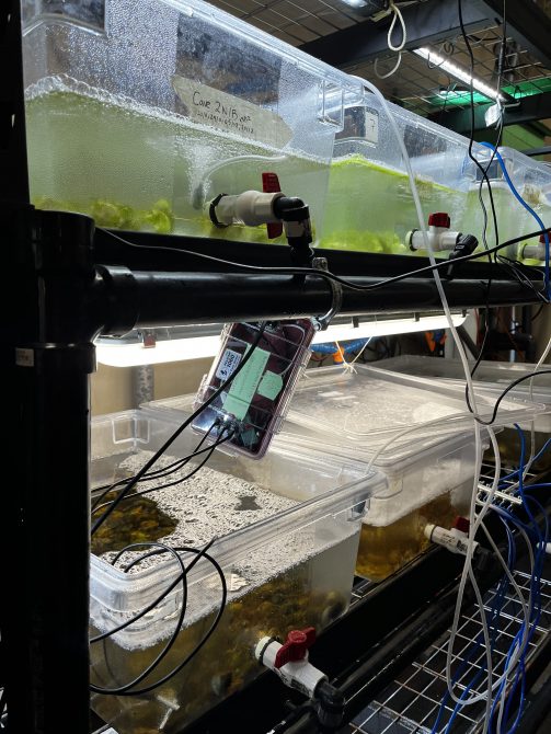 Pour notre projet, nous voulions profiter de l’occasion pour nous immerger dans le monde de la recherche en conservation des océans. Avec le travail continu de l’équipe Seaforestation sur la culture et la replantation de varech, cela nous a inspirés à les contacter pour voir ce que nous pouvons faire pour aider et en apprendre davantage. Ce projet a eu lieu alors que la pépinière de varech d’Ocean Wise est située loin de leur siège social. Disposer d’une surveillance de l’eau à distance en temps réel permettrait de suivre des paramètres de qualité de l’eau tels que la température, la salinité, le pH et les niveaux de nutriments, garantissant ainsi l’environnement optimal de croissance pour le varech. Un besoin a été identifié de fournir des alertes en cas d’anomalie, de réduire le besoin de visites fréquentes sur place tout en améliorant le taux de réussite des jeunes kelplings à la pépinière. Pour atteindre notre objectif, nous avons combiné mes connaissances préalables (de Nicole) en soins d’aquarium et le parcours de Sebastian en ingénierie ; nous nous sommes associés pour créer ces capteurs et un journal de suivi des algues afin d’aider le laboratoire à continuer d’améliorer ses résultats à l’avenir.
