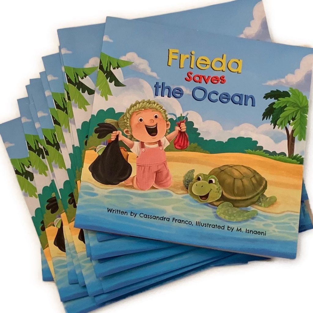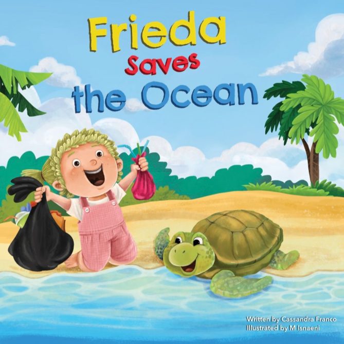 “Frieda Saves the Ocean” is aimed to educate children about plastic pollution in the ocean and cleaning up the shoreline. The fictional picture book is about a young girl who goes to the beach and is frustrated by all the garbage laying around in the sand where she is trying to play. She is approached by a friendly sea turtle who teaches her about the issues of plastic pollution and its effects on the sea creatures. The young girl, Frieda, is inspired to pick up garbage on the beach and encourages everyone around her to do the same.