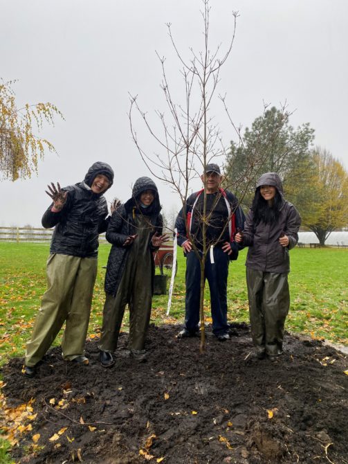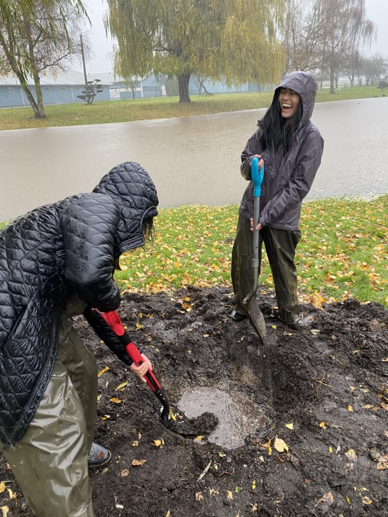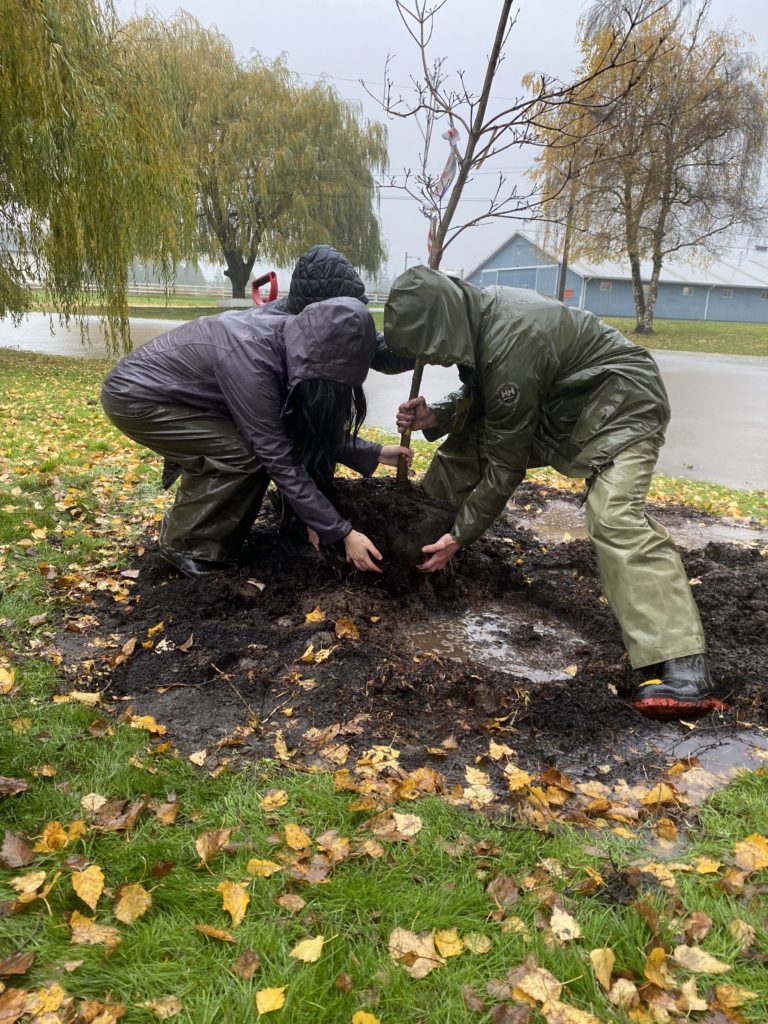 The day that we planted the tree we were also in the middle of a rain storm. It seemed like mother nature was against us, it was hard to see clearly, our holes kept filling up with water, and the team was soaking wet afterwards. It took a bit of extra work but we finally were able to have the tree planted securely!